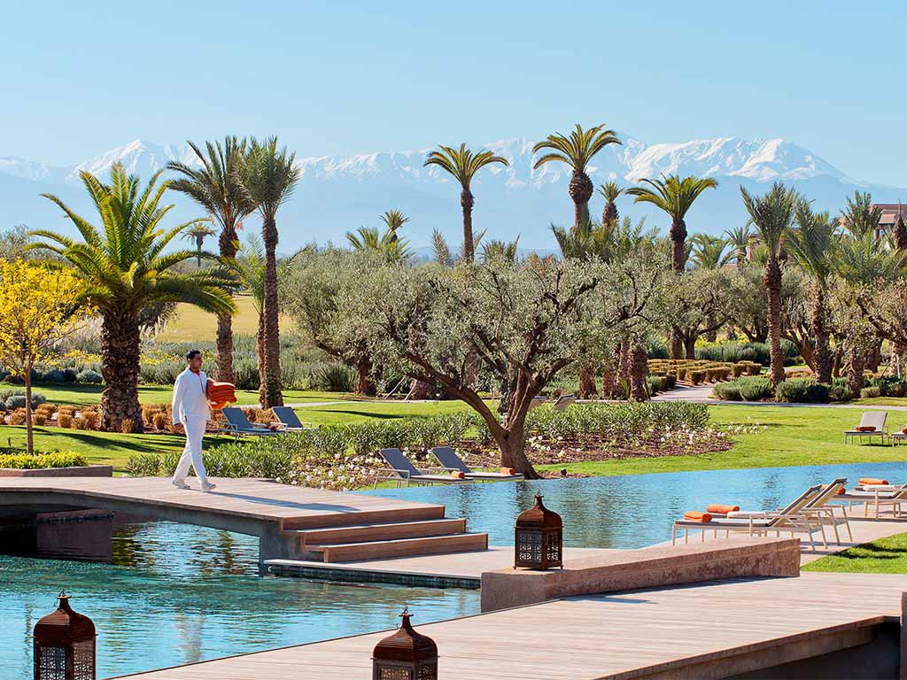 20 Chambres de luxe (72 m²) : dotée d'un salon intégré et d'une luxueuse salle de bains en marbre équipée d'un sol en Beijmat, les chambres disposent d'une terrasse rafraîchissante donnant sur le terrain de golf et les montagnes de l'Atlas. La décoration de la chambre Deluxe revisite les intérieurs marocains traditionnels autour d'une combinaison subtile de meubles artisanaux locaux et d'autres plus modernes. À la fois élégante et spacieuse, la chambre Deluxe est équipée de meubles fabriqués à la main par des artisans locaux et de tapis marocains traditionnels à motifs géométriques colorés qui ont permis de créer une véritable atmosphère marocaine.